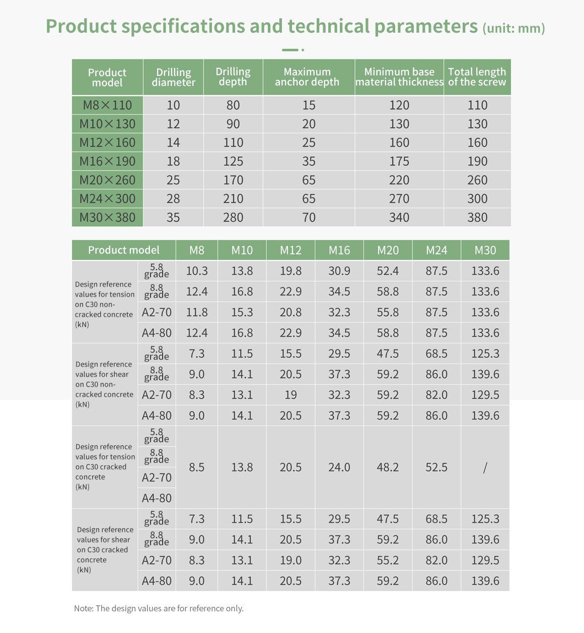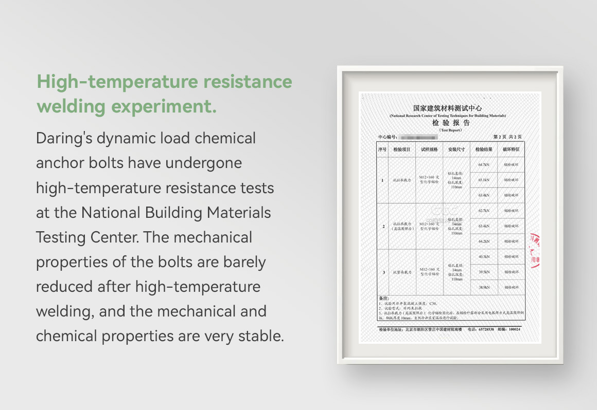 Daring dynamic load chemical anchor is composed of a special tapered screw and dynamic load components. The material can be selected from 5.8 grade carbon steel or 304/316 stainless steel. The surface treatment of the anchor (except for stainless steel material) includes electroplating zinc and hot-dip galvanizing. It is installed with Daring injection epoxy resin anchoring adhesive. It is applied to fix rails for elevators, production robots, and other applications. It has stable anchoring performance under high load and vibration load.