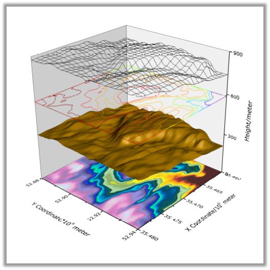 在一个图形层中堆叠多个曲面的3D OpenGL曲面图。通过为每个曲面指定唯一的打印样式和自定义Z偏移,可以自定义图形,某些